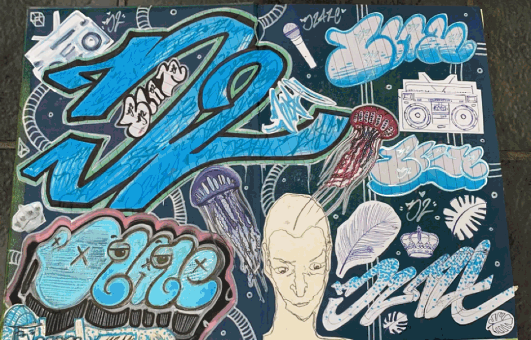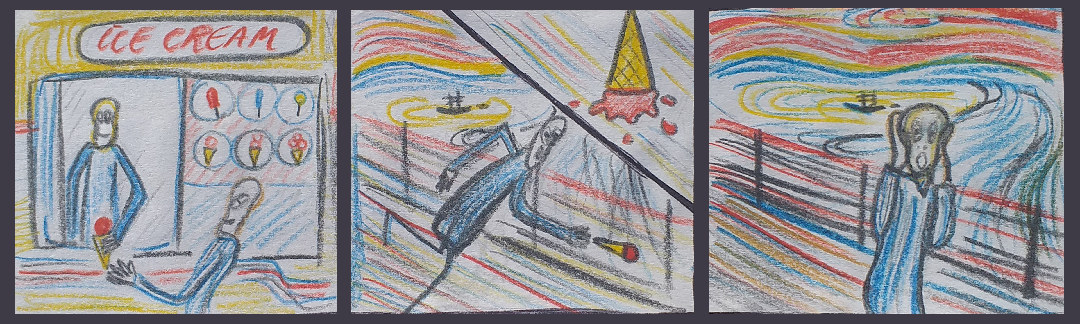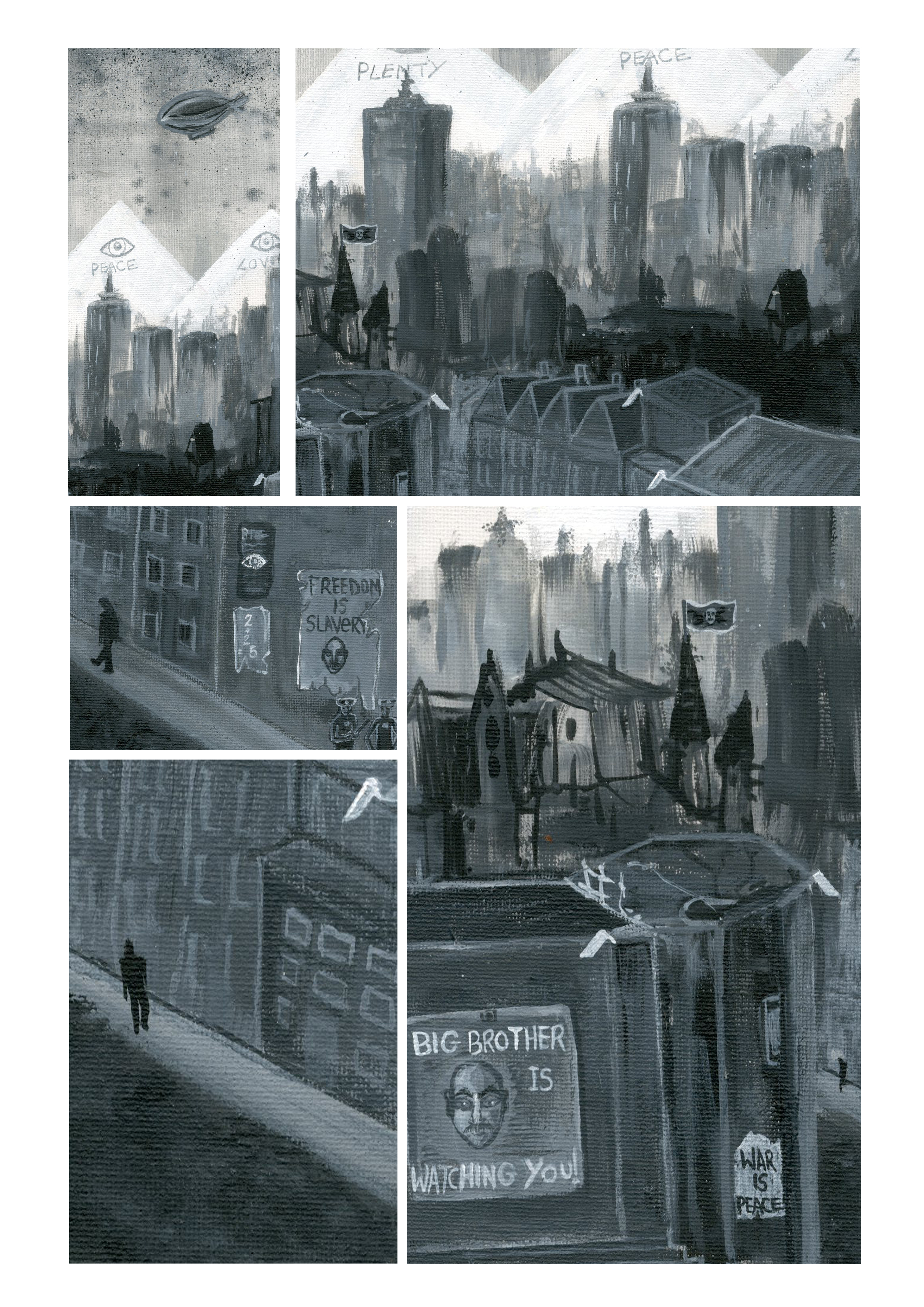 Narrative sequences- Ice Scream – Pencils, The Sharpening -Biro, and 1984 concept art -Acrylics on canvas